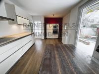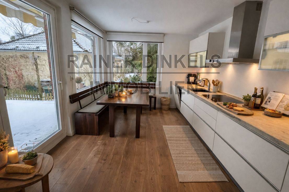 Die große Küche bietet Platz für einen großen Esstisch sowie großzügige Stell- und Arbeitsflächen. Eine große Fensterfront öffnet den Blick in den Garten und auf die Terrasse – Kochen, Essen und Garten sind hier selbstverständlich miteinander verbunden.